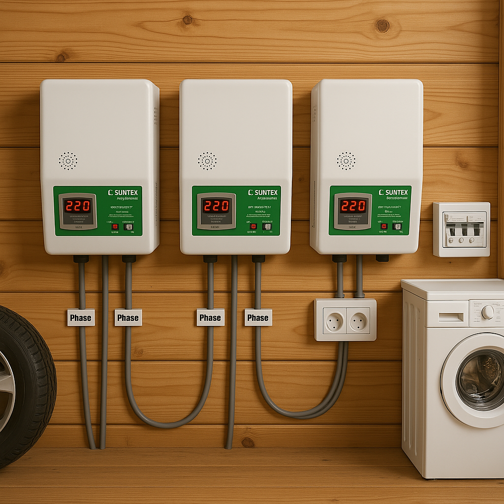Комплект из трех однофазных релейных стабилизаторов SUNTEK - это отличное предложение, которое позволяет надежно защитить всю бытовую технику от скачков напряжения и при этом существенно сэкономить при покупке.