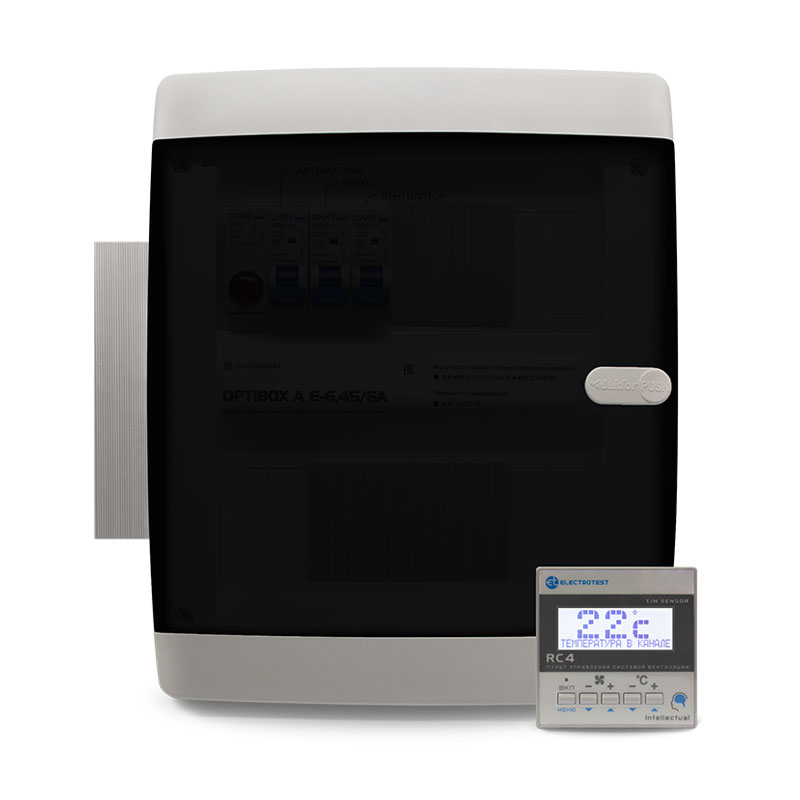 Шкаф управления OPTIBOX A E-12S/1-1.6A для систем вентиляции. Для 1 и 2 фазных нагревателей, для 3 фазных двигателей. Плавное управление электрокалорифером до 12 кВт. В комплекте с пультом ДУ.