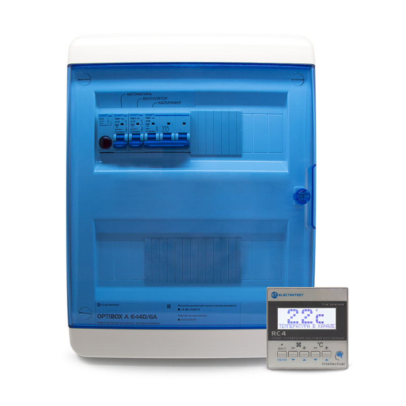 Шкаф управления OPTIBOX серии A E-D для систем вентиляции с дискретным электрическим нагревом. Управление калорифером через внешнее устройство. Для 3 фазных двигателей. В комплекте с пультом ДУ.